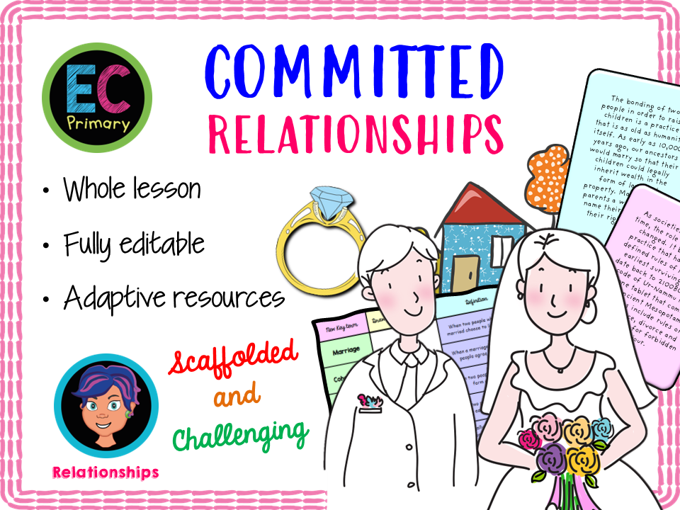 Committed relationships PSHE Lesson. A one hour-long, detailed, fully resourced KS2 PSHE discussing commitment and the reasons why some couples choose to marry or become civil partners. We will learn about different types of families and discuss the way that marriage has evolved over the centuries, including relatively recent changes to the legislation surrounding same-sex unions.