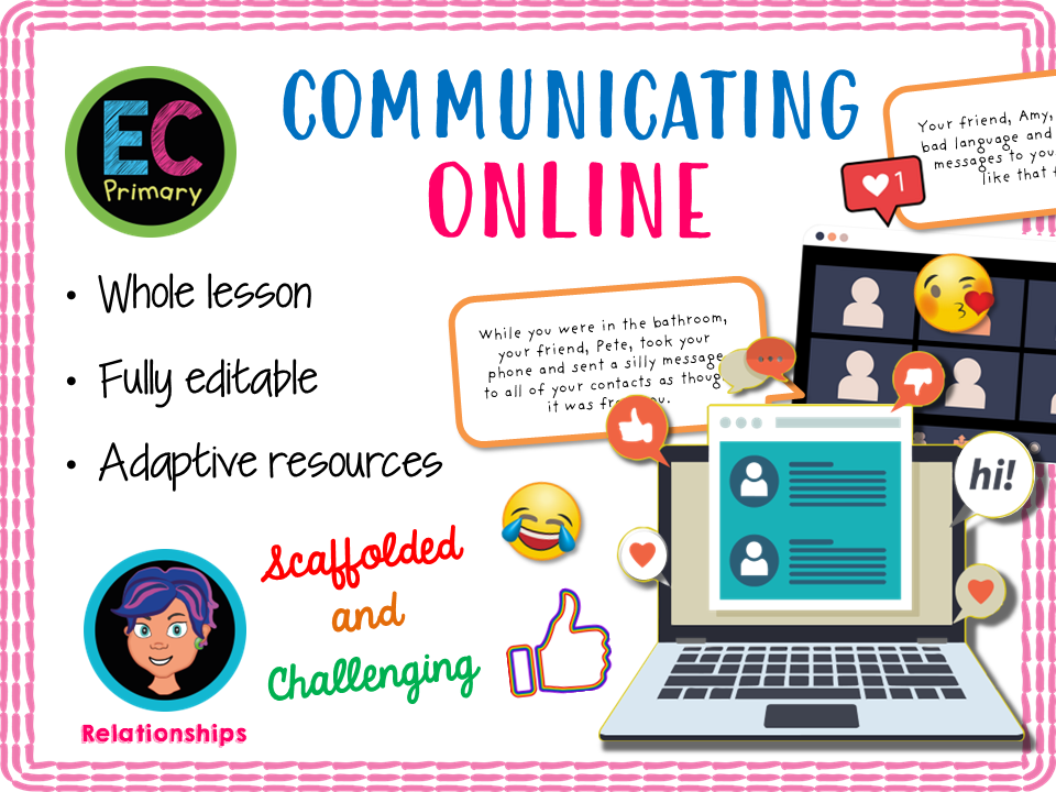 Communicating online PSHE Lesson. A one hour-long, very detailed, fully resourced PSHE lesson suitable for KS2. In this lesson, the students will discuss why we need to be careful when communicating with others online. We will discuss ways that we can be respectful to others, and identify examples of unacceptable online behaviour. We will look at how sarcasm and intonation rarely translate well in written messages, often leading to unnecessary upset. .