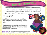Diversity in the UK - an hour-long lesson suitable for KS2 or low ability Year 7s, all about the meaning of diversity and how Britain is a diverse country. It is well differentiated with three-level challenges for each task, contains a variety of activities, an hour long PowerPoint, a clip with questions, a literacy focus task, new key-term introductions, homework, reading aloud materials and creative tasks. The lesson encourages students to reflect on their own diverse backgrounds and consider how they treat those different to themselves. It is created as part of a KS2 British Values scheme of work. It is fully editable, engaging and very easy to follow.