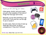 Age restrictions - what are they and why should we follow them? In this lesson, the students will explore different types of age restrictions with a specific focus on film, TV, gaming, and social media. The students will investigate some of the key dangers of accessing content underage such as online grooming, data protection, and accessing inappropriate content.