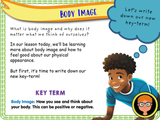 Body image - what is it and why does it matter what we think of ourselves? A one-hour lesson suitable for upper KS2 or lower ability KS3 group, all about the meaning of body image and what makes some people have a negative or positive body image. It is well differentiated with three-level challenges for each task, contains a variety of activities, an hour long PowerPoint, a clip with questions, new key-term introductions, reading aloud materials and creative tasks.