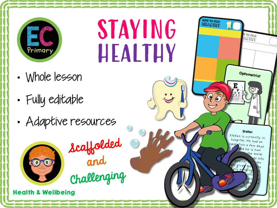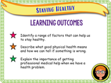 Staying healthy PSHE Lesson. A one hour-long, very detailed, fully resourced PSHE lesson suitable for KS2. In this lesson, the students will discuss what it means to have good physical health. We will discuss ways that we can maintain a healthy balanced lifestyle, and discuss why it is important to seek professional help when we have a medical problem. The lesson includes case studies, a match-up task, a video clip with questions, and a 'design an app' activity.