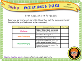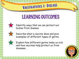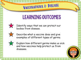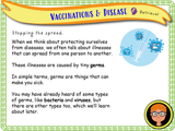 Vaccinations and disease lesson. A one hour-long, very detailed, fully resourced PSHE lesson suitable for KS2. This lesson allows students to explore what disease is, different types of diseases, how they spread and why we need and use vaccinations - as well as how they work. There are literacy tasks, match up tasks, creative tasks, clip tasks and much more.